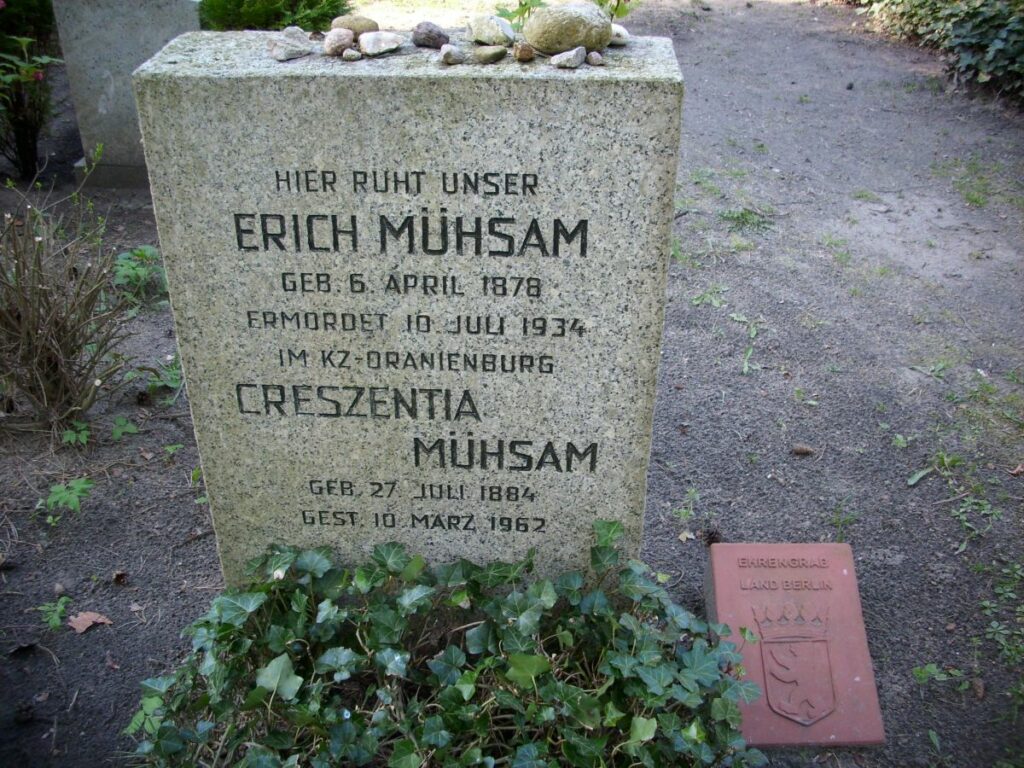 In der Nacht zum 10.7.34 wurde Erich Mühsam von der SS ermordet. Seine Unbeugsamkeit wurde zum Symbol des antifaschistischen Widerstands. Beigesetzt am 15. 7. 34 auf dem Waldfriedhof Berlin-Dahlem.
