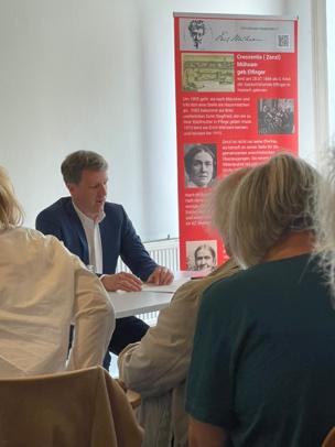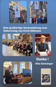 Rita Steininger stellte ihre neue Doppelbiographie von Erich und Zenzl Mühsam vor. Ihr lebhafter und ergreifender Vortrag war ein ganz besonderes Erlebnis, auch weil erstmals die beiden Mühsams gemeinsam dargestellt und geehrt wurden. Unter ihrem Lebensleitspruch „Glück und Frieden aufzurichten“ kämpften sie zusammen gegen Faschismus, Antisemitismus, Unterdrückung und Militarismus. Sie kämpften für Gerechtigkeit, Gleichheit und Teilhabe aller Menschen.
