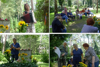 Wie in jedem Jahr trafen sich Freundinnen und Freunde von Erich und Zenzl Mühsam am Grab und gedachten der beiden mutigen Menschen. Leider mussten wir wegen des Starkregens ein überdachtes Plätzchen aufsuchen. Aber auch dort spielte Isabel Neuenfeldt auf dem Akkordeon, es wurde gesungen und rezitiert und das Picknick genossen, das unsere Freundin Susanne Misere jedes Jahr bereitet.